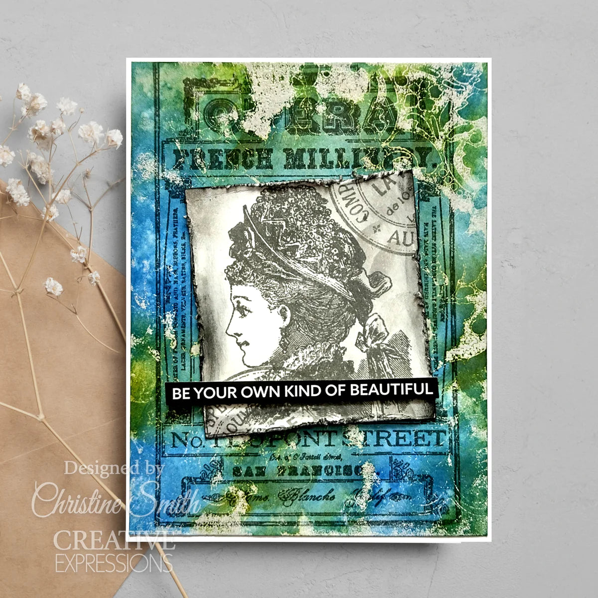 La Mode is a vintage Inspired clear stamp set designed by Taylor Made Journals which can be used for cards, journals, home décor and so much more. These High quality photopolymer clear stamp sets are ideal for adding images to any project. Ready to mount on an acrylic block the stamps can be used with ink pads, paint, or used with pigment and embossing powder. They are suitable for paper fabric, or any other surface depending on the ink choice. Made In UK. 5 stamps. Size 6 in x 8 in (15.2 cm x 20.3 cm).