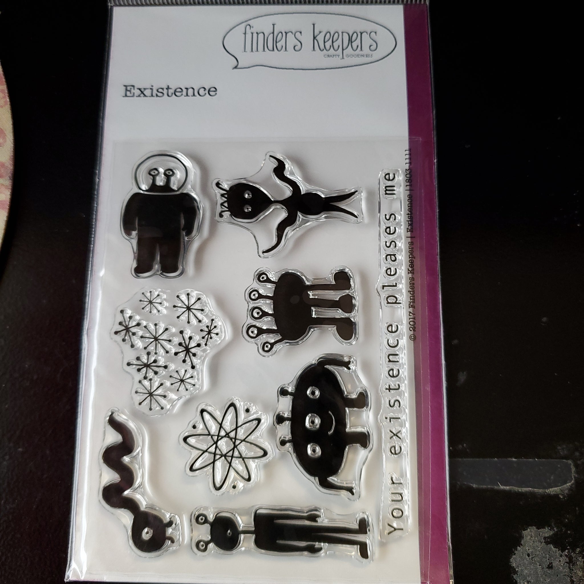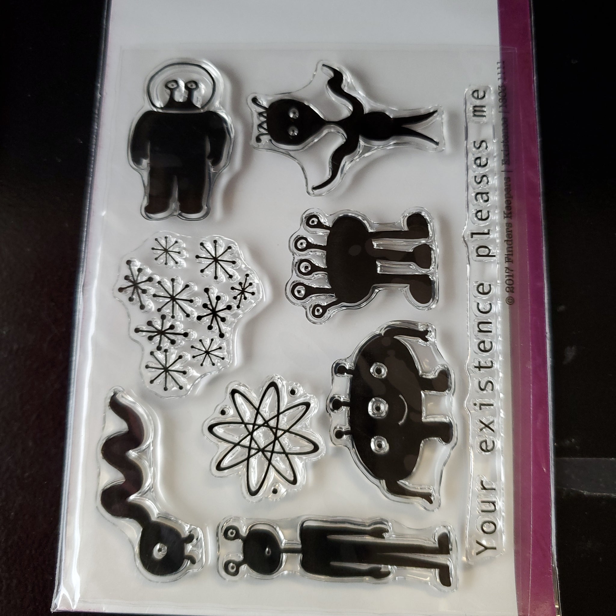 "Stamp your uniqueness with Finders Keepers' Existence Clear Stamp Set (1803-1111). Includes 9 stamps, featuring 6 playful aliens and the hilarious phrase, "Your existence pleases me". Express yourself and bring some joy to your crafting!"