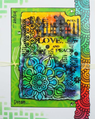 One stamp that incorporates several different images including a large mandala. A great grungy piece. Size: 3.75x5.5 inches.