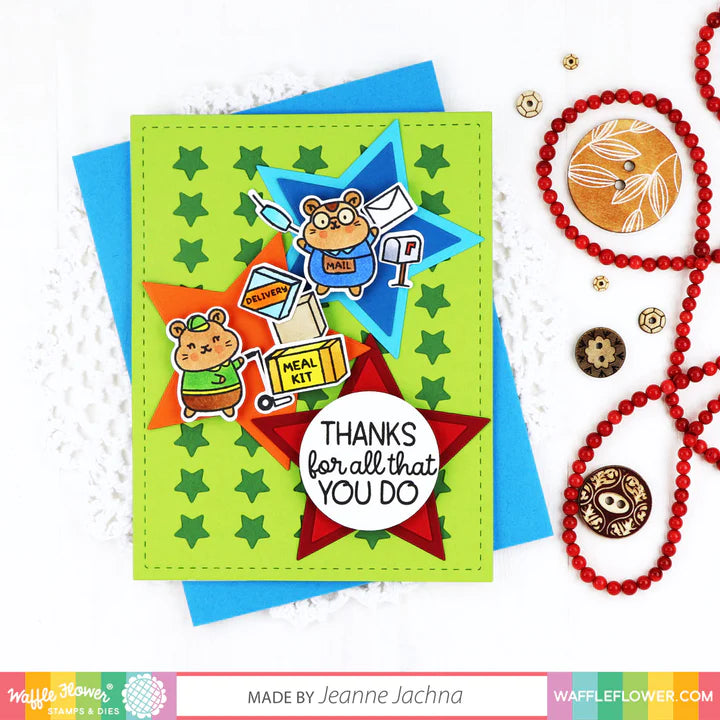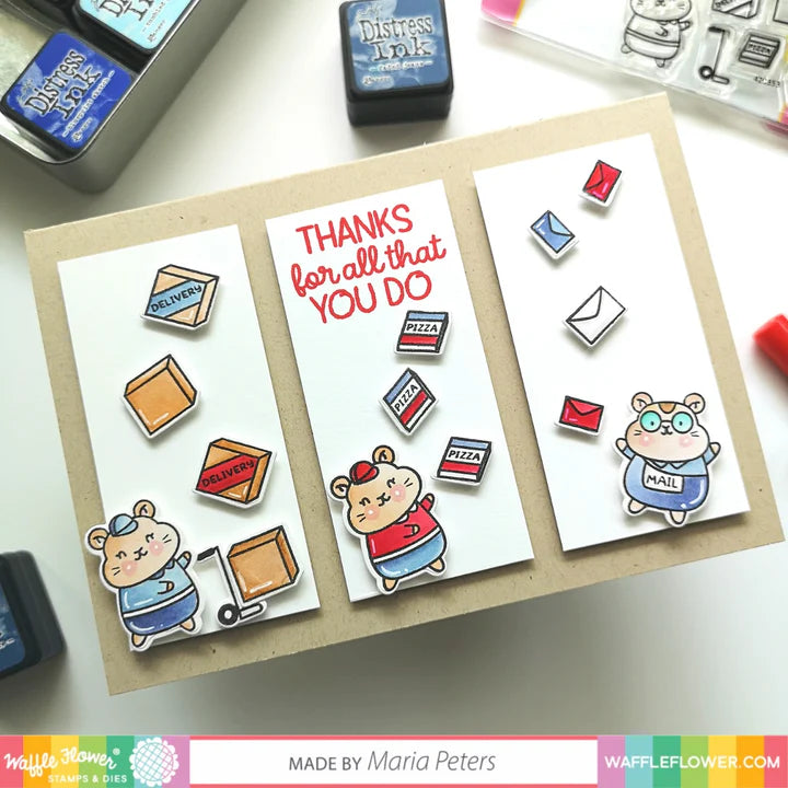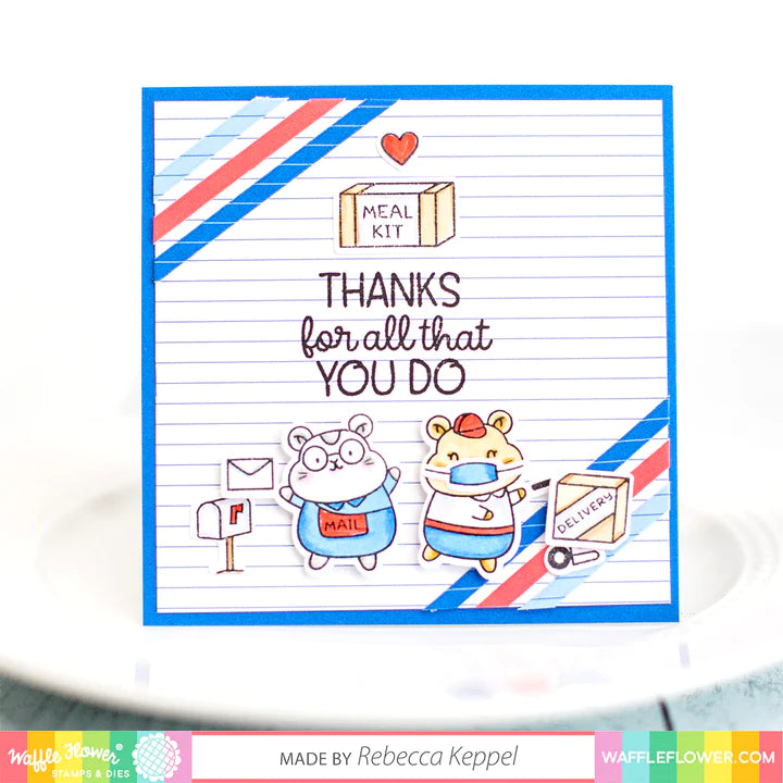 The Frontline Heroes 2 stamp set focuses on the folks that go the last mile! Whether delivering life-saving medical supplies, meals, and groceries, or heartfelt correspondence from loved ones, delivery workers play essential roles in our communities! This set includes a variety of delivery and postal workers and lots of fun accessories! Give thanks to your favorite delivery person with the Frontline Heroes 2 Set!