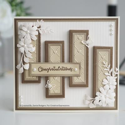 Use the Creative Expressions Jamie Rodgers Canvas Collection Rectangle die set to create easy to build canvas and frame effects on your projects. They are easy to construct and incredibly versatile, simply fold on the score lines and glue to create focal points for your projects. You can decorate them with the coordinating sentiment stamps or use inks, paints, die cuts and more to make your own unique art work. The Canvas Collection Craft Dies by Jamie Rodgers are of high quality steel and create a unique and flexible focal point to your projects.