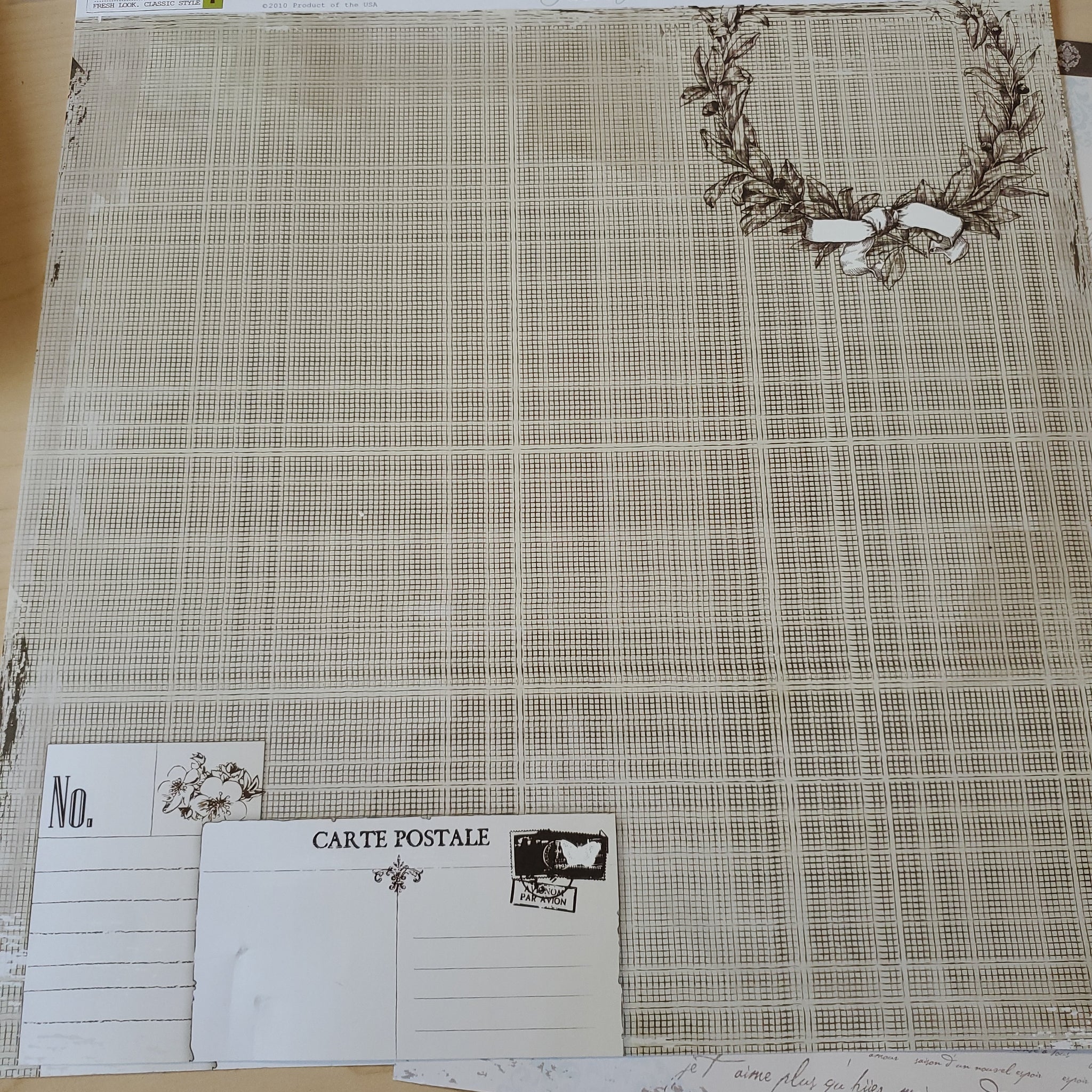 One side has a burlap style background with postcards and a wreath and the other side has handwritten text images