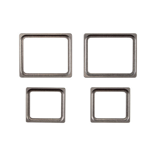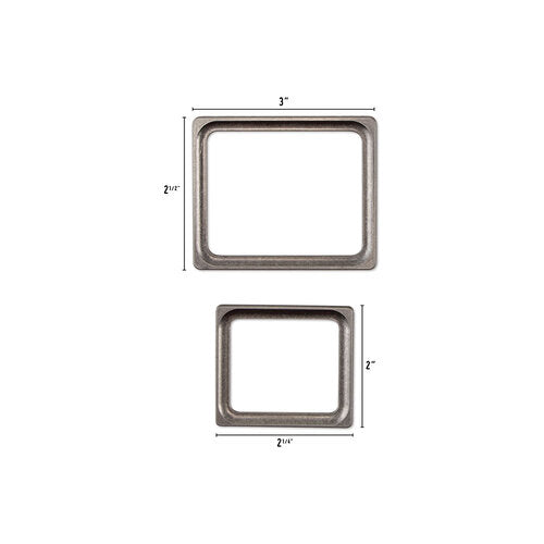 This package of four photo frames is designed by Tim Holtz for Idea-ology. These frames are made from brushed silver metal and work perfectly with the Photomatic and Photobooth prints (sold separately) and also from Tim Holtz and Idea-ology. The larger frames measure 2.98" x 2.48" x 0.1" and the smaller frames measure 2.24" x 1.98" x 0.1", there are two of each size. These frames can be added to cards, scrapbook pages, tags, journals, art journals, and other paper crafting and mixed media projects.
